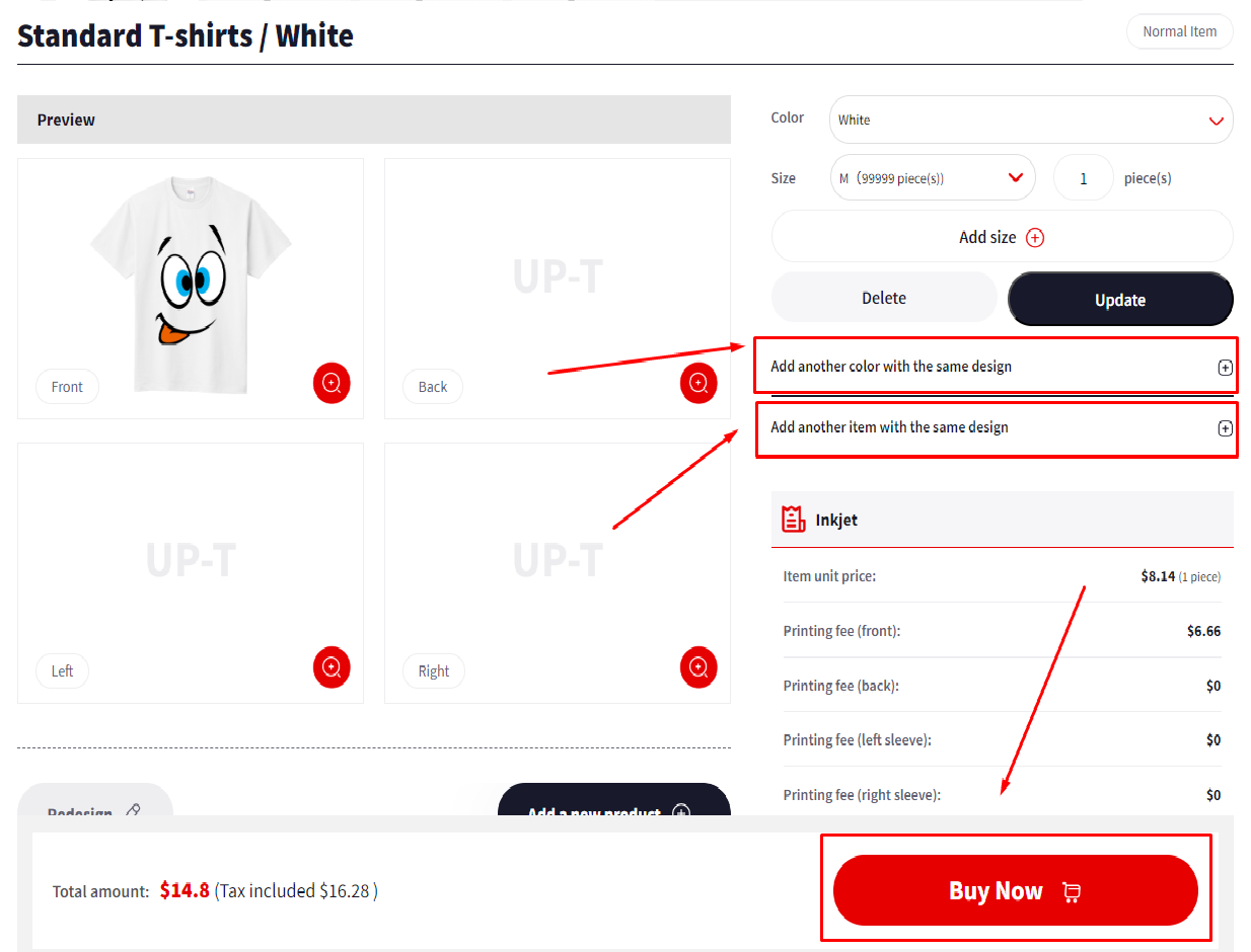 If you want several T-shirts in different sizes, you can purchase T-shirts in other sizes by clicking "Add Size". After clicking "Buy", please indicate your delivery address.